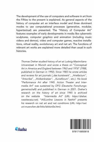 The development of the use of computers and software in art from the Fifties to the present is explained. As general aspects of the history of computer art an interface model and three dominant modes to use computational processes (generative, modular, hypertextual) are presented. The "History of Computer Art" features examples of early developments in media like cybernetic sculptures, computer graphics and animation (including music videos and demos), video and computer games, reactive installations, virtual reality, evolutionary art and net art. The functions of relevant art works are explained more detailed than usual in such histories.