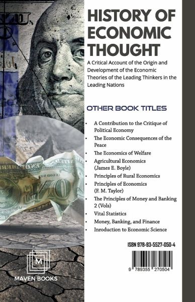General Introduction, Nature and importance of the history of economic thought, The origin and Tardy development of economic thoght, Economic thought before the science of economics, Economic thought of the ancients, Economic thought of the Hebrews and hindus, Economic thought of the Athenian philosophers, Roman economic thought, Medieval economic thought, The dawn of modern economic thoughtm Mercantilism, Kameralism, The evolution of economics as a science, The founders, The physiocrats and the revolution in social philosophy, Adam smith, his immediate predecessors, and the revolution in industry, The earlier followers, Pessimistic tendencies, Malthus and the theory of population, Ricardo and the theory of distribution especially the rent doctrine, Optimistic tendencies, Carey and the american school, Bastiat and the french optimists,