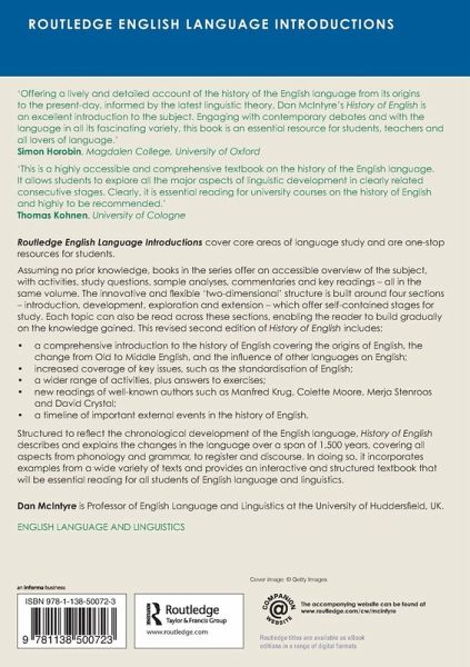 'Offering a lively and detailed account of the history of the English language from its origins to the present-day, informed by the latest linguistic theory, Dan McIntyre's History of English is an excellent introduction to the subject. Engaging with contemporary debates and with the language in all its fascinating variety, this book is an essential resource for students, teachers and all lovers of language.'