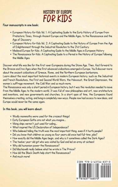 Four manuscripts in one book: European History for Kids Vol. 1: A Captivating Guide to the Early History of Europe from Prehistoric Times, through Ancient Europe and the Middle Ages, to the Renaissance and the Age of Discovery European History for Kids Vol. 2: A Captivating Guide to the History of Europe from the Age of Enlightenment through the Industrial Revolution to the 21st Century Medieval Europe for Kids: A Captivating Guide to the Middle Ages in European History The Renaissance for Kids: A Captivating Guide to a Period in the History of Europe Following the Middle Ages Discover what life was like for the first-ever Europeans during the Stone Age. Then, fast forward to the Bronze and Iron Ages when the first advanced civilizations emerged in Europe. You'll discover more about the ancient civilizations of Greece, Rome, and the Northern European barbarians.