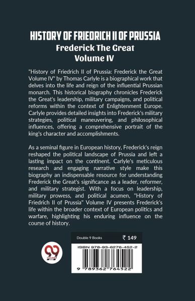 "History of Friedrich II of Prussia: Frederick the Great Volume IV" by Thomas Carlyle is a biographical work that delves into the life and reign of the influential Prussian monarch. This historical biography chronicles Frederick the Great's leadership, military campaigns, and political reforms within the context of Enlightenment Europe. Carlyle provides detailed insights into Frederick's military strategies, political maneuvering, and philosophical influences, offering a comprehensive portrait of the king's character and accomplishments. As a seminal figure in European history, Frederick's reign reshaped the political landscape of Prussia and left a lasting impact on the continent. Carlyle's meticulous research and engaging narrative style make this biography an indispensable resource for understanding Frederick the Great's significance as a leader, reformer, and military strategist. With a focus on leadership, military prowess, and political acumen, "History of Friedrich II of Prussia" Volume IV presents Frederick's life within the broader context of European politics and warfare, highlighting his enduring influence on the course of history.
