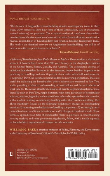 A History of Homebuilders from Early Modern to Modern Times provides a diachronic account of homebuilders' more than 500 years history in the Anglosphere nations of the U.S., Britain, Canada, and Australia. The comparative absence of individual homebuilders' histories in the literature, despite builders' importance in providing our dwellings and over 70% of our entire urban built environments, is surprising. Part One introduces homebuilders from several perspectives. These are useful for evaluating the homebuilders' whose histories are presented in Part Two, and in providing a balanced understanding of homebuilders and the societal value of what they do. The actual, albeit brief, histories of mainly large homebuilders for more than 500 years in Part II, supply historians with some particulars of homebuilder attitudes, practices, ingenuity, and resourcefulness in how they operated over the centuries, with a modest trending to community building rather than just housebuilding. Part Three specifically focuses on the following evolutionary changes in homebuilding practices: 1) increasing standardization of dwelling components, 2) increasingly institutionalized sources of financial assistance, and 3) changes in production scale. Three technical appendices on dates of homebuilder 'firsts' in practices; in conceptualizing housing markets; and some government regulations, follow, with a fourth appendix on homebuilders' organizational changes over the centuries.