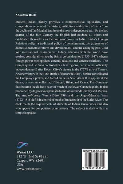Modern Indian History provides a comprehensive, up-to-date, and compendious account of the history, institutions and culture of India from the decline of the Mughal Empire to the post-independence era. By the last quarter of the 18th Century the English had outdone all others and established themselves as the dominant power in India. India's Foreign Relations reflect a traditional policy of nonalignment, the exigencies of domestic economic reform and development, and the changing post-Cold War international environment. India's relations with the world have evolved considerably since the British colonial period (1757-1947), when a foreign power monopolized external relations and defense relations. The Company had de facto control over a few regions, but were not officially independent until after Robert Clive's victory in the 1757 Battle of Plassey. Another victory in the 1764 Battle of Buxar (in Bihar), further consolidated the Company's power, and forced emperor Shah Alam II to appoint it the diwan, or revenue collector, of Bengal, Bihar, and Orissa. The Company thus became the de facto ruler of much of the lower Gangetic plain. It also proceeded by degrees to expand its dominions around Bombay and Madras. The Anglo-Mysore Wars (1766-1799) and the Anglo-Maratha Wars (1772-1818) left it in control of much of India south of the Sutlej River. The book meets the requirements of students of Indian Universities and also who appear for competitive examinations. The subject is dealt with in a simple language.