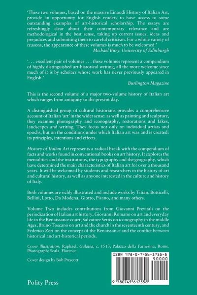 This is the second volume of a major two-volume history of Italian art which ranges from antiquity to the present day. A distinguished group of cultural historians provides a comprehensive account of Italian "art" in the wider sense: as well as painting and sculpture, they examine photography and iconography, restorations and fakes, landscapes and writing. They focus not only on individual artists and epochs, but on the conditions under which Italian art was and is created: its principles, intentions and effects. History of Italian Art represents a radical break with the compendium of facts and works found in conventional books on art history, exploring the mentalities and the institutions, the typography and the geography which have determined the main characteristics of Italian art over a thousand years. It will be welcomed by students and researchers in the history of art and cultural history, as well as anyone interested in the culture and history of Italy. Both volumes are richly illustrated and include works by Titian, Botticelli, Bellini, Lotto, Da Modena, Giotto, Pisano, and many others. Volume II includes contributions from Giovanni Previtali on the periodization of Italian art history, Giovanni Romero on art and everyday life in the Renaisssance court, Salvatore Settis on iconography in the Middle Ages, Bruno Toscano on art and the church in the seventeenth century, and Federico Zeri on the concept of the Renaissance and the conflict between historical and art-historical periods.