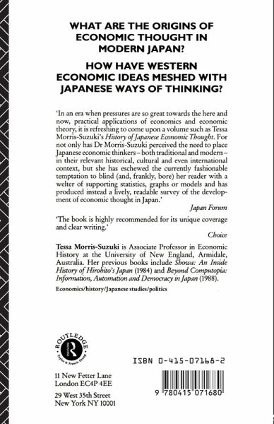 Economics, in the modern sense of the word, was introduced into Japan in the second half of the nineteenth century. However, Japanese thinkers had already developed, during the seventeenth and eighteenth centuries, a variety of interesting approaches to issues such as the causes of inflation, the value of trade, and the role of the state in economic activity. Tessa Morris-Suzuki provides the first comprehensive English language survey of the development of economic thought in Japan. She considers how the study of neo-classical and Keynesian economics was given new impetus by Japan's 'economic miracle' while Marxist thought, particularly well established in Japan, was developing along lines that are only now beginning to be recognized by the West. She concludes with an examination of the radical rethinking of fundamental economic theory currently occuring in Japan and outlines some of the exciting new approaches which are emerging from this 'shaking of the foundations.