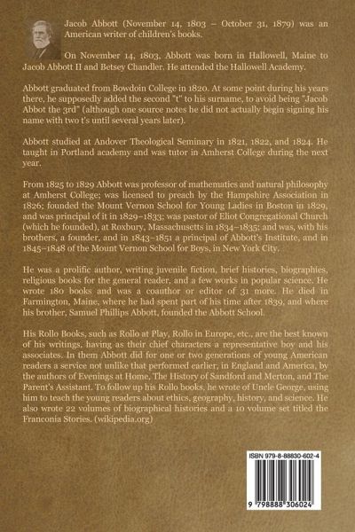 An excellent biography not just of Julius Caesar but of the times he was born into, raised during, and which ultimately lead to his ascension and demise. I've read more than a few books regarding this time period and this is the most excellent and the most concise. Anyone curious of the rise and fall of the man should not miss out on this one. (Will Arbaugh) About the author: Jacob Abbott (November 14, 1803 - October 31, 1879) was an American writer of children's books. On November 14, 1803, Abbott was born in Hallowell, Maine to Jacob Abbott II and Betsey Chandler. He attended the Hallowell Academy. Abbott graduated from Bowdoin College in 1820. At some point during his years there, he supposedly added the second "t" to his surname, to avoid being "Jacob Abbot the 3rd" (although one source notes he did not actually begin signing his name with two t's until several years later). Abbott studied at Andover Theological Seminary in 1821, 1822, and 1824. He taught in Portland academy and was tutor in Amherst College during the next year. From 1825 to 1829 Abbott was professor of mathematics and natural philosophy at Amherst College; was licensed to preach by the Hampshire Association in 1826; founded the Mount Vernon School for Young Ladies in Boston in 1829, and was principal of it in 1829-1833; was pastor of Eliot Congregational Church (which he founded), at Roxbury, Massachusetts in 1834-1835; and was, with his brothers, a founder, and in 1843-1851 a principal of Abbott's Institute, and in 1845-1848 of the Mount Vernon School for Boys, in New York City. He was a prolific author, writing juvenile fiction, brief histories, biographies, religious books for the general reader, and a few works in popular science. He wrote 180 books and was a coauthor or editor of 31 more. He died in Farmington, Maine, where he had spent part of his time after 1839, and where his brother, Samuel Phillips Abbott, founded the Abbott School. His Rollo Books, such as Rollo at Play, Rollo in Europe, etc., are the best known of his writings, having as their chief characters a representative boy and his associates. In them Abbott did for one or two generations of young American readers a service not unlike that performed earlier, in England and America, by the authors of Evenings at Home, The History of Sandford and Merton, and The Parent's Assistant. To follow up his Rollo books, he wrote of Uncle George, using him to teach the young readers about ethics, geography, history, and science. He also wrote 22 volumes of biographical histories and a 10 volume set titled the Franconia Stories. (wikipedia.org)