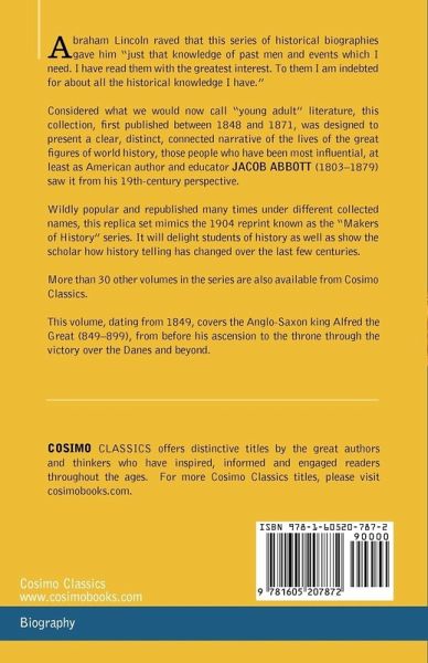 Abraham Lincoln raved that this series of historical biographies gave him "just that knowledge of past men and events which I need. I have read them with the greatest interest. To them I am indebted for about all the historical knowledge I have." Considered what we would now call "young adult" literature, this collection, first published between 1848 and 1871, was designed to present a clear, distinct, connected narrative of the lives of the great figures of world history, those people who have been most influential, at least as American author and educator JACOB ABBOTT (1803-1879) saw it from his 19th-century perspective. Wildly popular and republished many times under different collected names, this replica set mimics the 1904 reprint known as the "Makers of History" series. It will delight students of history as well as show the scholar how history telling has changed over the last few centuries. More than 30 other volumes in the series are also available from Cosimo Classics. This volume, dating from 1849, covers the Anglo-Saxon king Alfred the Great (849-899), from before his ascension to the throne through the victory over the Danes and beyond.