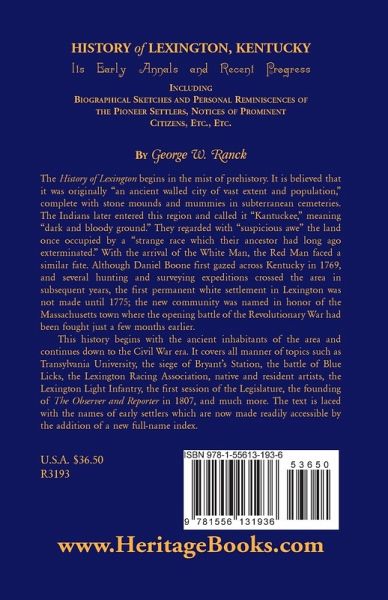 The History of Lexington begins in the mist of prehistory. It is believed that it was originally "an ancient walled city of vast extent and population," complete with stone mounds and mummies in subterranean cemeteries. The Indians later entered this region and called it "Kantuckee," meaning "dark and bloody ground." They regarded with "suspicious awe" the land once occupied by a "strange race which their ancestor had long ago exterminated." With the arrival of the White Man, the Red Man faced a similar fate. Although Daniel Boone first gazed across Kentucky in 1769, and several hunting and surveying expeditions crossed the area in subsequent years, the first permanent white settlement in Lexington was not made until 1775; the new community was named in honor of the Massachusetts town where the opening battle of the Revolutionary War had been fought just a few months earlier. This history begins with the ancient inhabitants of the area and continues down to the Civil War era. It covers all manner of topics such as Transylvania University, the siege of Bryant's Station, the battle of Blue Licks, the Lexington Racing Association, native and resident artists, the Lexington Light Infantry, the first session of the Legislature, the founding of The Observer and Reporter in 1807, and much more. The text is laced with the names of early settlers which are now made readily accessible by the addition of a new full-name index.