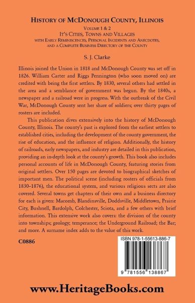 Illinois joined the Union in 1818 and McDonough County was set off in 1826. William Carter and Riggs Pennington (who soon moved on) are credited with being the first settlers. By 1830, several others had settled in the area and a semblance of government was begun. By the 1840s, a newspaper and a railroad were in progress. With the outbreak of the Civil War, McDonough County sent her share of soldiers; over thirty pages of rosters are included. This publication dives extensively into the history of McDonough County, Illinois. The county's past is explored from the earliest settlers to established cities, including the development of the county government, the rise of education, and the influence of religion. Additionally, the history of railroads, early newspapers, and industry are detailed in this publication, providing an in-depth look at the county's growth. This book also includes personal accounts of life in McDonough County, featuring stories from original settlers. Over 150 pages are devoted to biographical sketches of important men. The political scene (including rosters of officials from 1830-1876), the educational system, and various religious sects are also covered. Several towns get chapters of their own and a business directory for each is given: Macomb, Blandinsville, Doddsville, Middletown, Prairie City, Bushnell, Bardolph, Colchester, Sciota, and a few others with brief information. This extensive work also covers: the division of the county into townships; geology; temperance; the Underground Railroad; the Bar; and more. A surname index adds to the value of this work.