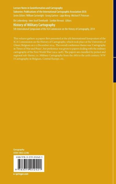 This volume gathers 19 papers first presented at the 5th International Symposium of the ICA Commission on the History of Cartography, which took place at the University of Ghent, Belgium on 2-5 December 2014. The overall conference theme was 'Cartography in Times of War and Peace', but preference was given to papers dealing with the military cartography of the First World War (1914-1918). The papers are classified by period and regional sub-theme, i.e. Military Cartography from the 18th to the 20th century; WW I Cartography in Belgium, Central Europe, etc.