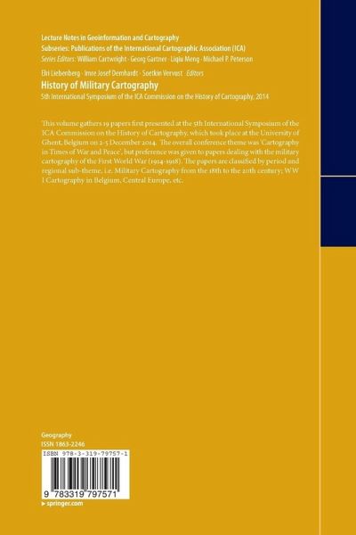 This volume gathers 19 papers first presented at the 5th International Symposium of the ICA Commission on the History of Cartography, which took place at the University of Ghent, Belgium on 2-5 December 2014. The overall conference theme was 'Cartography in Times of War and Peace', but preference was given to papers dealing with the military cartography of the First World War (1914-1918). The papers are classified by period and regional sub-theme, i.e. Military Cartography from the 18th to the 20th century; WW I Cartography in Belgium, Central Europe, etc.