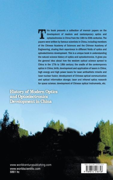 This book presents a collection of memoir papers on the development of modern and contemporary optics and optoelectronics in China from the 18th to 20th centuries. The papers were written by famous scientists in China, including members of the Chinese Academy of Sciences and the Chinese Academy of Engineering, sharing their experience in different fields of optics and optoelectronics development. This is a unique book in understanding the natural science history of optics and optoelectronics. It gives you the general idea about how the western optical science spread to China in the 17th to 18th century; the cradle of the contemporary optics in China; Birth, development and application of lasers in China; high energy and high power lasers for laser antiballistic missile and laser nuclear fusion; development of Chinese optical communication and optical information storage; laser and infrared optics research for space science; development of Chinese optical instruments, etc.