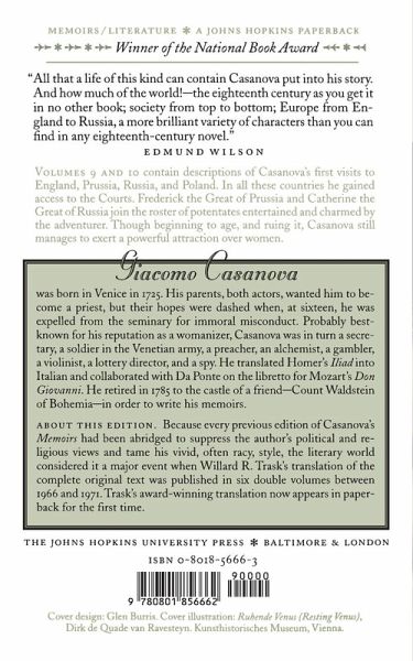 Volumes 9 and 10 contain descriptions of Casanova's first visits to England, Prussia, Russia, and Poland. In all these countries he gained access to the Courts. Frederick the Great of Prussia and Catherine the Great of Russia join the roster of potentates entertained and charmed by the adventurer. Though beginning to age, and ruing it, Casanova still manages to exert a powerful attraction on women.