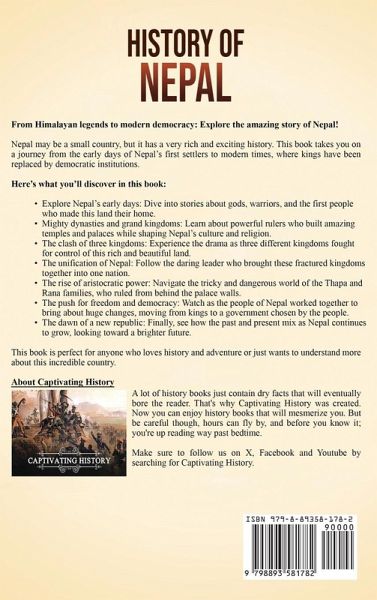 From Himalayan legends to modern democracy: Explore the amazing story of Nepal! Nepal may be a small country, but it has a very rich and exciting history. This book takes you on a journey from the early days of Nepal's first settlers to modern times, where kings have been replaced by democratic institutions. Here's what you'll discover in this book: Explore Nepal's early days: Dive into stories about gods, warriors, and the first people who made this land their home. Mighty dynasties and grand kingdoms: Learn about powerful rulers who built amazing temples and palaces while shaping Nepal's culture and religion. The clash of three kingdoms: Experience the drama as three different kingdoms fought for control of this rich and beautiful land. The unification of Nepal: Follow the daring leader who brought these fractured kingdoms together into one nation. The rise of aristocratic power: Navigate the tricky and dangerous world of the Thapa and Rana families, who ruled from behind the palace walls. The push for freedom and democracy: Watch as the people of Nepal worked together to bring about huge changes, moving from kings to a government chosen by the people. The dawn of a new republic: Finally, see how the past and present mix as Nepal continues to grow, looking toward a brighter future. This book is perfect for anyone who loves history and adventure or just wants to understand more about this incredible country.