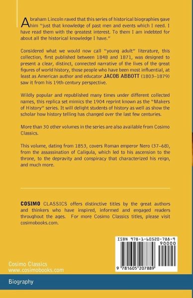 Abraham Lincoln raved that this series of historical biographies gave him "just that knowledge of past men and events which I need. I have read them with the greatest interest. To them I am indebted for about all the historical knowledge I have." Considered what we would now call "young adult" literature, this collection, first published between 1848 and 1871, was designed to present a clear, distinct, connected narrative of the lives of the great figures of world history, those people who have been most influential, at least as American author and educator JACOB ABBOTT (1803-1879) saw it from his 19th-century perspective. Wildly popular and republished many times under different collected names, this replica set mimics the 1904 reprint known as the "Makers of History" series. It will delight students of history as well as show the scholar how history telling has changed over the last few centuries. More than 30 other volumes in the series are also available from Cosimo Classics. This volume, dating from 1853, covers Roman emperor Nero (37-68), from the assassination of Caligula, which led to his ascension to the throne, to the depravity and conspiracy that characterized his reign, and much more.