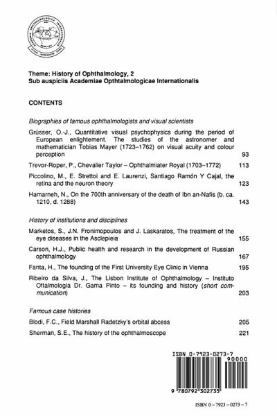 Biographies of famous ophthalmologists and visual scientists.- Quantitative visual psychophysics during the period of European enlightenment. The studies of the astronomer and mathematician Tobias Mayer (1723-1762) on visual acuity and colour perception.- Chevalier Taylor - Ophthalmiater Royal (1703-1772).- Santiago Ramón Y Cajal, the retina and the neuron theory.- On the 700th anniversary of the death of Ibn an-Nafis (b. ca. 1210, d. 1288).- History of institutions and disciplines.- The treatment of eye diseases in the Asclepieia.- Public health and research in the development of Russian ophthalmology.- The founding of the First University Eye Clinic in Vienna.- The Lisbon Institute of Ophthalmology - Instituto de Oftalmologia Dr. Gama Pinto - its founding and history.- Famous case histories.- Field Marshall Radetzky's orbital abscess.- The history of the ophthalmoscope.