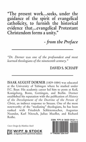 Isaak August Dorner (1809-1884) was educated at the University of Tubingen where he studied under F.C. Baur. His academic career led him to posts at Keil, Konigsberg, Bonn, Gottingen, and Berlin. Dorner established his reputation with the publication of 'History of the Development of the Doctrine of the Person of Christ', an indirect response to Strauss. One of the most noteworthy of the "mediating" theologians, he has been ranked with Friedrich Schleiermacher, August Neander, Karl Nitzsch, Julius Mueller, and Richard Rothe.