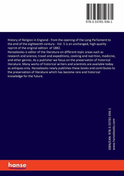 History of Religion in England - from the opening of the Long Parliament to the end of the eighteenth century - Vol. 5 is an unchanged, high-quality reprint of the original edition of 1882.