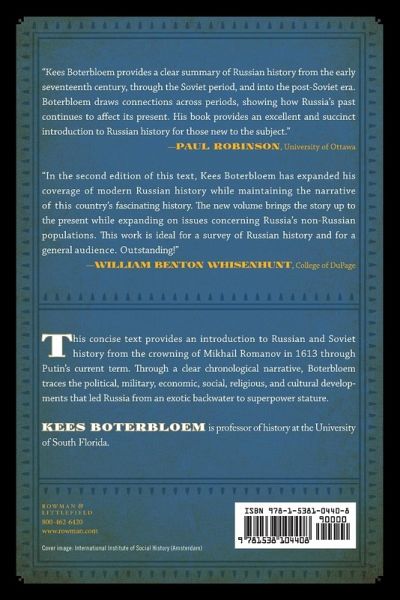 This concise text provides an introduction to Russian and Soviet history from the crowning of Mikhail Romanov in 1613 to Putin's current term. Through a clear chronological narrative, Boterbloem traces the political, military, economic, social, religious, and cultural developments that led Russia from an exotic backwater to superpower stature.