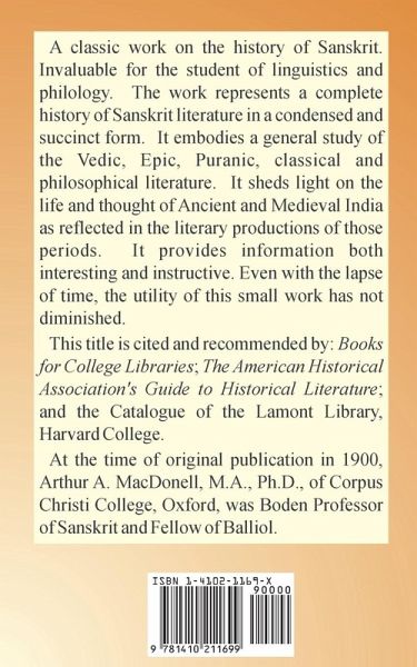 A classic work on the history of Sanskrit. Invaluable for the student of linguistics and philology. The work represents a complete history of Sanskrit literature in a condensed and succinct form. It embodies a general study of the Vedic, Epic, Puranic, classical and philosophical literature. It sheds light on the life and thought of Ancient and Medieval India as reflected in the literary productions of those periods. It provides information both interesting and instructive. Even with the lapse of time, the utility of this small work has not diminished. This title is cited and recommended by: Books for College Libraries; The American Historical Association's Guide to Historical Literature; and the Catalogue of the Lamont Library, Harvard College. At the time of original publication in 1900, Arthur A. MacDonell, M.A., Ph.D., of Corpus Christi College, Oxford, was Boden Professor of Sanskrit and Fellow of Balliol.