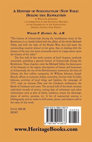 "The history of Schenectady during the troublesome times of the Revolution is so closely linked with the affairs of the whole Mohawk Valley, and with the tides of the Border Wars that laid waste the surrounding country almost to her gates, that, in dealing with the history of the one, one must necessarily touch to a large extent upon the history of the other." The first half of this work consists of brief chapters, profusely annotated, providing a general history of Schenectady during the Revolution. These chapters cover the Mohawk Valley, the dominance of the Iroquois in the region, descriptions of homes and businesses in Schenectady, the rise of the Revolutionary movement, the Sons of Liberty, the first militia companies, Sir William Johnson, Joseph Brandt, efforts to maintain Indian neutrality, friction with Sir John Johnson, activities of local whigs and loyalists, the campaign of 1777, raids on German Flats and the Schoharie settlements, the Battle of Oriskany and more. The second half of the book contains individual records of service, noting date of enlistment and other information such as date of death, residence, reason for discharge, places of service, pension, etc. A list of manuscript sources, a bibliography, and an index to full-names, places, and subjects add to the value of this work.