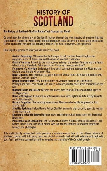 The History of Scotland-The Tiny Nation That Changed the World! Here is just a glimpse of what you will find in this book: Ancient Beginnings: Who were the first people to call Scotland home? Explore the enigmatic ruins of Skara Brae and the dawn of Scottish civilization. Clash of Cultures: Delve into the interactions between the ancient Romans and the fierce inhabitants of Caledonia. What secrets do these early encounters hold? Formation of a Kingdom: Understand the pivotal connections between the Picts and the Gaels in creating the Kingdom of Alba. Regal Lineages: From Kenneth I to Mary, Queen of Scots, meet the kings and queens who defined Scottish royalty. Religious Revolutions: How did the Church of Scotland come to be, and what is Presbyterianism? Learn about John Knox's influence and the short-lived dominance of the Kirk. Highland Feuds and Heroes: Witness the bloody clan feuds and the indomitable spirit of the Highlanders. Union with England: Explore the controversial union with England and its lasting impacts on Scottish identity. Historic Tragedies: The haunting massacre of Glencoe-what really happened on that fateful night? Jacobite Uprisings: Follow Bonnie Prince Charlie's dramatic and romantic quest to reclaim the British throne. Scotland's Industrial Spark: Discover how Scottish ingenuity helped ignite the Industrial Revolution. Philosophers and Economists: Get to know the brilliant minds of Francis Hutcheson, Lord Kames, David Hume, and Adam Smith, who laid the foundations for modern capitalism, history, and philosophy.