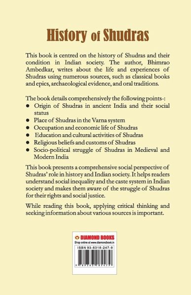 This book is centred on the history of Shudras and their condition in Indian society. The author, Bhimrao Ambedkar, writes about the life and experiences of Shudras using numerous sources, such as classical books and epics, archaeological evidence, and oral traditions. The book details comprehensively the following points-: ? Origin of Shudras in ancient India and their social status ¿ Place of Shudras in the Varna system ? Occupation and economic life of Shudras ? Education and cultural activities of Shudras ? Religious beliefs and customs of Shudras ? Socio-political struggle of Shudras in Medieval and Modern India This book presents a comprehensive social perspective of Shudras' role in history and Indian society. It helps readers understand social inequality and the caste system in Indian society and makes them aware of the struggle of Shudras for their rights and social justice. While reading this book, applying critical thinking and seeking information about various sources is important.