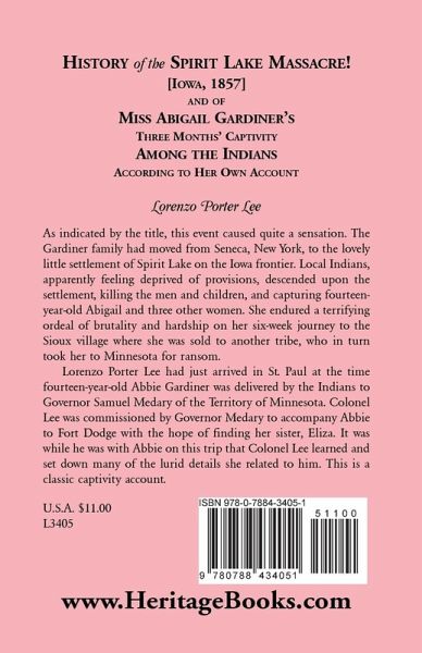 As indicated by the title, this event caused quite a sensation. The Gardiner family had moved from Seneca, New York, to the lovely little settlement of Spirit Lake on the Iowa frontier. Local Indians, apparently feeling deprived of provisions, descended upton the settlement, killing the men and children, and capturing fourteen-year-old Abigail and three other women. She endured a terrifying ordeal of brutality and hardship on her six-week journey to the Sioux village where she was sold to another tribe, who in turn took her to Minnesota for ransom. Lorenzo Porter Lee had just arrived in St. Paul at the time fourteen-year-old Abbie Gardiner was delivered by the Indians to Governor Samuel Medary of the Territory of Minnesota. Colonel Lee was commissioned by Governor Medary to accompany Abbie to Fort Dodge with the hope of finding her sister, Eliza. It was while he was with Abbie on this trip that Colonel Lee learned and set down many of the lurid details she related to him. A classic captivity account.