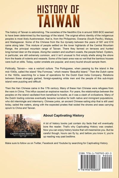 If you want to discover the captivating history of Taiwan, then keep reading... The history of Taiwan is astonishing. Politically, Taiwan— was a warlord culture. The Portuguese, when passing by the island in the mid-1540s, called the island "Ilha Formosa," which means "Beautiful Island." Then the Dutch came in the 1620s, searching for a base of operations for the Dutch East India Company. Then the Han Chinese came in the 17th century. Many of these Han Chinese were refugees from the wars in China. This influx caused an explosive reaction. And then came the Japanese in 1894! Taiwan was subjugated to a Japanese program of inculcation. All the people of Taiwan had to learn Japanese, and Shinto shrines cropped up everywhere. Then came Chiang Kai-shek in 1949. He awakened the conflict between the vestiges of Japanese influences and the Republic of China. Having been inflicted with so many cultural and political invasions, a new breed of Taiwanese people rose up, and they wanted freedom from the oppression they had faced for decades, although there were some who wanted socialism and communism. Taiwan is not even recognized as an independent sovereign by every country in the world today. Read Taiwan’s story—a story of an island that walks a tightrope searching for its identity, balance, and fate. In History of Taiwan: A Captivating Guide to Taiwanese History and the Relationship with the People's Republic of China, you will discover topics such as Formosa: Beautiful Island The Arrival of the Chinese and Their Religion The Dutch Trading Years The Ming, The Qing, and Japan: The War Years Japanese Taiwan The Sino-Japanese War & World War II Taiwan After World War II And much, much more! So if you want to learn more about the history of Taiwan, scroll up and click the "add to cart" button!