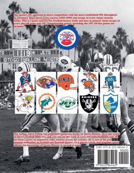 The upstart AFL operated in direct competition with the more established NFL throughout its existence. Read about every season {1960-1969} and recaps of every teams seasons inside. This is a great read for Pro Football history buffs and fans in general. Game recaps of every playoff game and AFL Championship games, including the AFL All-Star games are included.