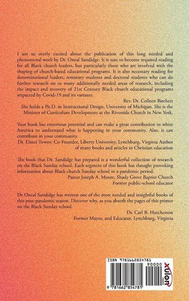 I am so overly excited about the publication of this long needed and phenomenal work by Dr. Oneal Sandidge. It is sure to become required reading for all Black church leaders, but particularly those who are involved with the shaping of church-based educational programs. It is also necessary reading for denominational leaders, seminary students and doctoral students who can do further research on so many additionally needed areas of research, including the impact and recovery of 21st Century Black church educational programs impacted by Covid-19 and its variants. Rev. Dr. Colleen Birchett holds a Ph.D. in Instructional Design, University of Michigan. She is the Minister of Curriculum Development at the Riverside Church in New York. Your book has enormous potential and can make a great contribution to white America to understand what is happening in your community. Also, it can contribute in your community. Dr. Elmer Towns: Co-Founder, Liberty University, Lynchburg, Virginia. Author of many books and articles in Christian education. The book that Dr. Sandidge has prepared is a wonderful collection of research on the Black Sunday school. Each segment of this book has thought provoking information about Black church Sunday school in a pandemic period. Pastor Joseph A. Moore, Shady Grove Baptist Church, and former public-school educator Dr Oneal Sandidge has written one of the most needed and insightful books of this post-pandemic season. Discover why, as you absorb the pages of this primer on the Black Sunday school. Dr. Carl B. Hutcherson, Former Mayor, and Educator, Lynchburg, Virginia