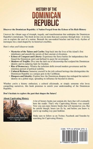 Discover the Dominican Republic: A Nation Forged from the Echoes of Its Rich History Uncover the vibrant saga of triumph, tragedy, and transformation that underpins the Dominican Republic's storied past. This book invites you on more than just a journey through time-it invites you to explore the soul of a nation. Beneath the sun-soaked beaches and the lively rhythm of merengue lies a land shaped by its historical crucibles. Here's what you'll discover inside: Mysteries of the Taínos and Caribs: Step back into the lives of the island's first inhabitants and unearth the secrets of their ancient civilizations. Echoes of Conquest and Liberty: Experience the fierce battles for independence that forged the Dominican spirit and defined its quest for sovereignty. Shadows of Trujillo: Dive into the dark era of dictatorship that sculpted the Dominican identity and its enduring fight for freedom. Rise of Democracy: Witness the turbulent shifts toward modern governance and the relentless pursuit of political stability. Cultural Richness: Immerse yourself in the rich cultural heritage that distinguishes the Dominican Republic as a unique gem in the Caribbean. Diaspora and Identity: Explore how the Dominican diaspora has reshaped the nation's identity on a global stage, spreading its influence far beyond its shores. Whether you're a history enthusiast, a cultural aficionado, or simply someone who loves compelling narratives, this book promises to enrich your understanding of the Dominican Republic.