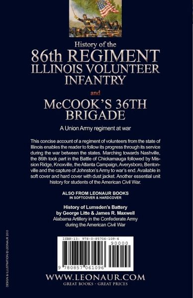 A Union Army regiment at war This concise account of a regiment of volunteers from the state of Illinois enables the reader to follow its progress through its service during the war between the states. Marching towards Nashville, the 86th took part in the Battle of Chickamauga followed by Mission Ridge, Knoxville, the Atlanta Campaign, Averysboro, Bentonville and the capture of Johnston's Army to war's end. Available in soft cover and hard cover with dust jacket. Another essential unit history for students of the American Civil War.