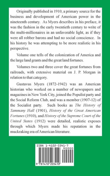 Originally published in 1910, a primary source for the business and development of American power in the nineteenth century. As Myers describes in his preface, it was the fashion in the early twentieth century to write of the multi-millionaires in an unfavorable light, as if they were all robber barons and had no social conscience. In his history he was attempting to be more realistic in his perspective. Volume one tells of the colonization of America and the large land grants and the great land fortunes. Volumes two and three cover the great fortunes from railroads, with extensive material on J. P. Morgan in relation to that category. Gustavus Myers (1872-1942) was an American historian who worked on a number of newspapers and magazines in New York City, joined the Populist party and the Social Reform Club, and was a member (1907-12) of the Socialist party. Such books as The History of Tammany Hall (1901), History of the Great American Fortunes (1910), and History of the Supreme Court of the United States (1912) were detailed, realistic exposes through which Myers made his reputation in the muckraking era of American literature.