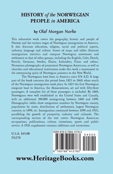 This exhaustive work covers the geography, history and people of Norway and the various stages of Norwegian immigration to America. It also discusses education, religion, social and political aspects, industry, language and culture. Scores of maps and tables illustrate immigration statistics and compare Norwegian movement and settlement to that of other groups, including the English, Celts, Dutch, French, Germans, Swedes, Danes, Icelanders, Finns and others. Numerous photographs of prominent Norwegian Americans, as well as churches and educational institutions make this work a monument to the enterprising spirit of Norwegian pioneers to the New World. The Norwegians have been in America since 876 A.D. A large part of the book concerns the period from 1825 to 1860, when much of the Norwegian immigration took place. In 1825 the first Norwegian emigrant boat to America, the Restaurationen, set sail with fifty-three passengers. A complete list of these passengers is included. By 1860, Norwegians were well established in the United States and Canada, with an additional 300,000 immigrating between 1860 and 1890. Demographic tables show emigration numbers by Norwegian county, population by states, distribution of settlements, largest Norwegian counties in 1890, etc. Immigration continued between 1890 and 1925, paralleling the growth of prosperity, industry and railroads. The corresponding section of the text covers Norwegian American occupations, publications, culture, inventions, sports and public service. A 1926 supplement contains additions and corrections.