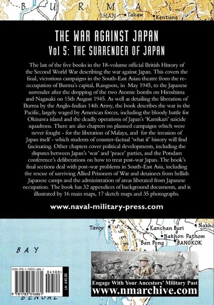 The last of the five books in the 18-volume official British History of the Second World War describing the war against Japan. This covers the final, victorious campaigns in the South-East Asian theatre from the re-occupation of Burma's capital, Rangoon, in May 1945, to the Japanese surrender after the dropping of the two Atomic bombs on Hiroshima and Nagasaki on 15th August 1945. As well as detailing the liberation of Burma by the Anglo-Indian 14th Army, the book describes the war in the Pacific, largely waged by American forces, including the bloody battle for Okinawa island and the deadly operations of Japan's 'Kamikazi'suicide squadrons. There are also chapters on planned campaigns which were never fought - for the liberation of Malaya, and for the invasion of Japan itself - which students of counter-factual 'what if'history will find fascinating. Other chapters cover political developments, including the disputes between Japan's 'war'and 'peace'parties, and the Potsdam conference's deliberations on how to treat post-war Japan. The book's final sections deal with post-war problems in South-East Asia, including the rescue of surviving Allied Prisoners of War and detainees from hellish Japanese camps and the administration of areas liberated from Japanese occupation. The book has 32 appendices of background documents, and is illustrated by 16 main maps, 17 sketch maps and 35 photographs.