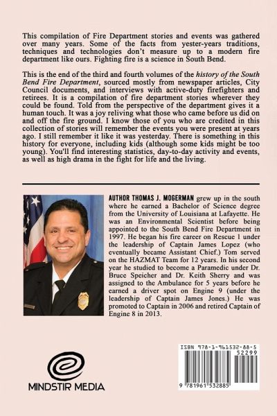 This compilation of Fire Department stories and events was gathered over many years. Some of the facts from yester-years traditions, techniques and technologies don't measure up to a modern fire department like ours. Fighting fire is a science in South Bend. This is the end of the third and fourth volumes of the history of the South Bend Fire Department, sourced mostly from newspaper articles, City Council documents, and interviews with active-duty firefighters and retirees. It is a compilation of fire department stories wherever they could be found. Told from the perspective of the department gives it a human touch. It was a joy reliving what those who came before us did on and off the fire ground. I know those of you who are credited in this collection of stories will remember the events you were present at years ago. I still remember it like it was yesterday. There is something in this history for everyone, including kids (although some kids might be too young). You'll find interesting statistics, day-to-day activity and events, as well as high drama in the fight for life and the living.