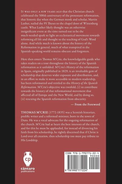 It was only a few years ago that the Christian church celebrated the 500th anniversary of the protestant reformation, that historic day when the German monk and scholar, Martin Luther, nailed the 95 Theses to the chapel door of Wittenberg castle. What Luther likely thought was an otherwise insignificant event at the time turned out to be the much-needed spark to light an ecclesiastical movement towards reforming all life and thought to the teaching of God's Word alone. And while much is known about the history of the Reformation in general, much of what transpired in the Spanish-speaking world remains obscure and forgotten. Here then enters Thomas M'Crie, the knowledgeable guide who takes readers on a tour throughout the history of the Spanish reformation as it unfolded. M'Crie's History of the reformation in Spain, originally published in 1829, is an invaluable gem of scholarship that deserves wider exposure and distribution, and, in an effort to make it more accessible to modern readership, has been reformatted and retitled to the History of the Spanish Reformation. M'Crie's objective was twofold, (i) to contribute towards the history of that reformational movement that affected all of Europe and the New World, and by doing so, (ii) rescuing the Spanish reformation from obscurity.- From the Foreword