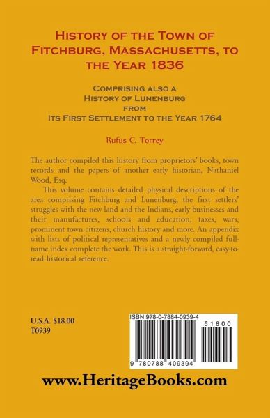 The author compiled this history from proprietors' books, town records and the papers of another early historian, Nathaniel Wood, Esq. This volume contains detailed physical descriptions of the area comprising Fitchburg and Lunenburg, the first settlers' struggles with the new land and the Indians, early businesses and their manufactures, schools and education, taxes, wars, prominent town citizens, church history and more. An appendix with lists of political representatives and a newly compiled full-name index complete the work. This is a straight-forward, easy-to-read historical reference.