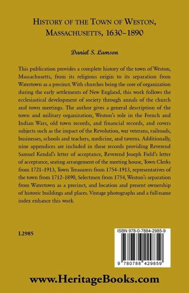 This publication provides a complete history of the town of Weston, Massachusetts, from its religious origin to its separation from Watertown as a precinct. With churches being the core of organization during the early settlements of New England, this work follows the ecclesiastical development of society through annals of the church and town meetings. The author gives a general description of the town and military organization, Weston's role in the French and Indian Wars, old town records, and financial records, and covers subjects such as the impact of the Revolution, war veterans, railroads, businesses, schools and teachers, medicine, and taverns. Additionally, nine appendices are included in these records providing Reverend Samuel Kendal's letter of acceptance, Reverend Joseph Field's letter of acceptance, seating arrangement of the meeting house, Town Clerks from 1721-1913, Town Treasurers from 1754-1913, representatives of the town from 1712-1890, Selectmen from 1754, Weston's separation from Watertown as a precinct, and location and present ownership of historic buildings and places. Vintage photographs and a full-name index enhance this work.