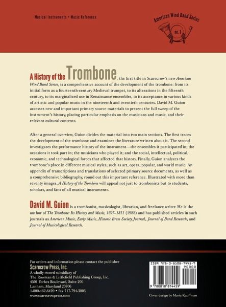 This book, the first in the American Wind Band series, is a comprehensive account of the development of the trombone, from its initial form as a 14th-century Medieval trumpet to its alterations in the 15th century; from its marginalized use in a particular Renaissance ensemble to its acceptance in various kinds of artistic and popular music in the 19th and 20th centuries. The book is fully illustrated with more than 80 images and includes an appendix of transcriptions of selected primary source documents with translations and a comprehensive bibliography.