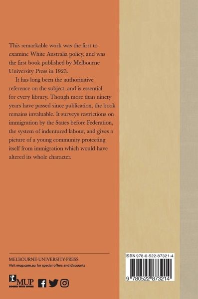 This remarkable work was the first to examine the White Australia policy, and was the first book published by Melbourne University Press, in 1923. It has long been the authoritative reference on the subject, and is essential for every library. Though more than ninety years have passed since publication, the book remains invaluable. It surveys restrictions on immigration by the States before Federation, the system of indentured labour, and gives a picture of a young community protecting itself from immigration which would have altered its whole character.
