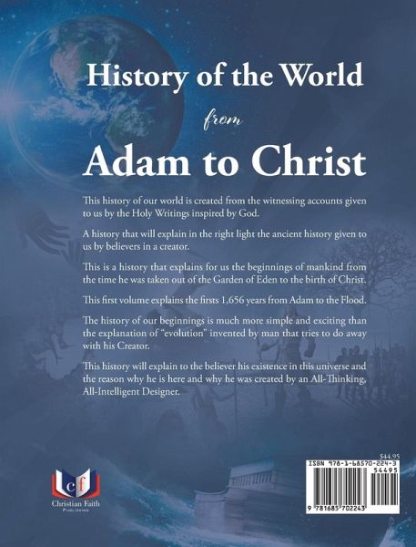 This history of our world is created from the witnessing accounts given to us by the Holy Writings inspired by God. A history that will explain in the right light the ancient history given to us by believers in a creator. This is a history that explains for us the beginnings of mankind from the time he was taken out of the Garden of Eden to the birth of Christ. This first volume explains the firsts 1,656 years from Adam to the Flood. The history of our beginnings is much more simple and exciting than the explanation of "evolution" invented by man that tries to do away with his Creator. This history will explain to the believer his existence in this universe and the reason why he is here and why he was created by an All-Thinking, All-Intelligent Designer.