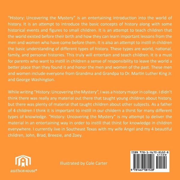 "History: Uncovering the Mystery" is an entertaining introduction into the world of history. It is an attempt to introduce the basic concepts of history along with some historical events and figures to small children. It is an attempt to teach children that the world existed before their birth and how they can learn important lessons from the men and women who have came before them. It is also an attempt to instill in children the basic understanding of different types of history. These types are world, national, family, and personal histories. This truly will entertain and teach children. It is a must for parents who want to instill in children a sense of responsibility to leave the world a better place than they found it and honor the men and women of the past. These men and women include everyone from Grandma and Grandpa to Dr. Martin Luther King Jr. and George Washington.