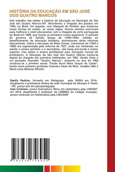 Este trabalho visa relatar a história da Educação no Município de São José dos Quatro Marcos-MT. Abordando a chegada dos jesuítas em 1549, no Brasil. Em seguida, com Marquês de Pombal, que instaurou novas formas de ensino, as cartas régias. Outros eventos ocorreram para melhorar o nível educacional, com a chegada da corte portuguesa ao Brasil em 1808, que trouxe os primeiros cursos superiores. O período de governo de Getúlio Vargas de (1930-1945), voltado ao beneficiamento da educação brasileira, aconteceram várias reformas educacionais. Sobre a educação de Mato Grosso, trataremos de (1930 a 1960) era regimentada pela reforma de 1927, onde era ministrado no estado o ensino primário e o secundário, não havia pré-escola e ensino superior, mas existia o ensino profissional para formação normal de professores. A Educação de São José dos Quatro Marcos iniciou-se depois da chegada dos primeiros habitantes, em 1962, dando início a um povoado chamado "Quatro Marcos", somente no ano de 1966 construiu-se a primeira escola "Escola Rural Mista Duque de Caxias", tendo como primeiro professor Francisco Paulo de Brito, Inivaldo Mila e Maria Luiza Barbosa Alfredo.