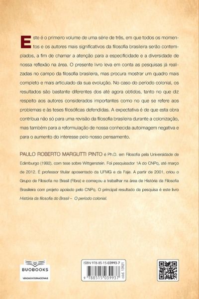 Este é o primeiro volume de uma série de três, em que todos os momentos e os autores mais significativos da filosofia brasileira serão contemplados, a fim de chamar a atenção para a especificidade e a diversidade de nossa reflexão na área. Este livro leva em conta as pesquisas já realizadas no campo da filosofia brasileira, mas procura mostrar um quadro mais completo e mais articulado da sua evolução.