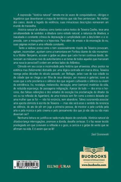 História natural da ditadura lança interrogações, promove a dúvida, desafia a certeza. E o faz nesse tecido privilegiado em que convivem a reflexão e o gozo, a carícia e o golpe de vento que se afirmam na vida. E é assim que se lê! Historia natural da ditadura, como tantos outros textos de Teixeira Coelho, tece uma simultaneidade de sentidos a ditadura como estado natural, a natureza da ditadura, a inacabada e constante crônica da depravação e cumplicidade com a des/ordem e a repressão. Com a mesquinhez e a hipocrisia. Para além do ensaio e da encenação do eu, suas páginas incitam a uma reflexão constante.