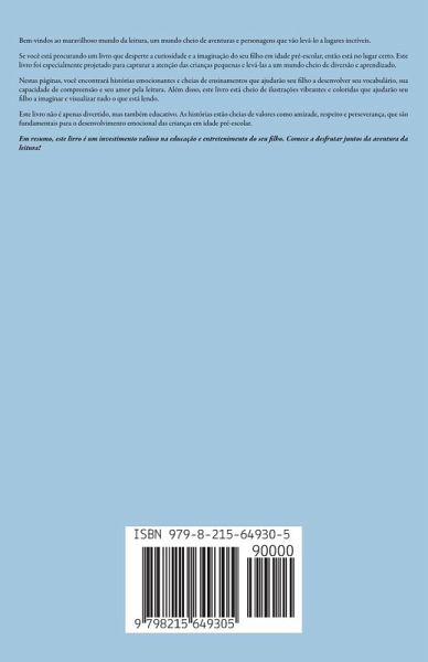 Bem-vindos ao maravilhoso mundo da leitura, um mundo cheio de aventuras e personagens que vão levá-lo a lugares incríveis. Se você está procurando um livro que desperte a curiosidade e a imaginação do seu filho em idade pré-escolar, então está no lugar certo. Este livro foi especialmente projetado para capturar a atenção das crianças pequenas e levá-las a um mundo cheio de diversão e aprendizado. Nestas páginas, você encontrará histórias emocionantes e cheias de ensinamentos que ajudarão seu filho a desenvolver seu vocabulário, sua capacidade de compreensão e seu amor pela leitura. Além disso, este livro está cheio de ilustrações vibrantes e coloridas que ajudarão seu filho a imaginar e visualizar tudo o que está lendo. Este livro não é apenas divertido, mas também educativo. As histórias estão cheias de valores como amizade, respeito e perseverança, que são fundamentais para o desenvolvimento emocional das crianças em idade pré-escolar. Em resumo, este livro é um investimento valioso na educação e entretenimento do seu filho. Comece a desfrutar juntos da aventura da leitura!