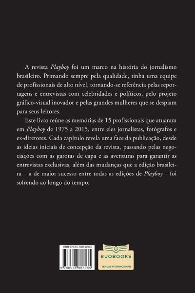 A revista Playboy foi um marco na história do jornalismo brasileiro. Primando sempre pela qualidade, tinha uma equipe de profissionais de alto nível, tornando-se referência pelas reportagens e entrevistas com celebridades e políticos, pelo projeto gráfico-visual inovador e pelas grandes mulheres que se despiam para seus leitores. Este livro reúne as memórias de 15 profissionais que atuaram em Playboy de 1975 a 2015, entre eles jornalistas, fotógrafos e ex-diretores. Cada capítulo revela uma face da publicação, desde as ideias iniciais de concepção da revista, passando pelas negociações com as garotas de capa e as aventuras para garantir as entrevistas exclusivas, além das mudanças que a edição brasileira ¿ a de maior sucesso entre todas as edições de Playboy ¿ foi sofrendo ao longo do tempo.