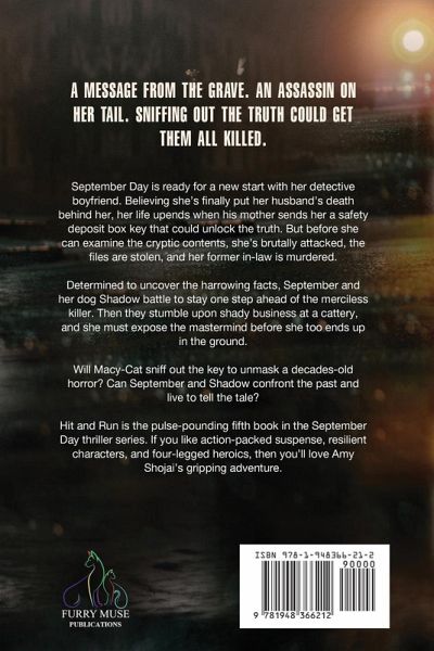 A message from the grave. An assassin on her tail. Sniffing out the truth could get them all killed. September Day is ready for a new start with her detective boyfriend. Believing she's finally put her husband's death behind her, her life upends when his mother sends her a safety deposit box key that could unlock the truth. But before she can examine the cryptic contents, she's brutally attacked, the files are stolen, and her former in-law is murdered. Determined to uncover the harrowing facts, September and her dog Shadow battle to stay one step ahead of the merciless killer. But when they stumble upon shady business at a cattery, she must expose the mastermind before she too ends up in the ground. Will Macy-Cat sniff out the key to unmask a decades-old horror? Can September and Shadow confront the past and live to tell the tale? Hit and Run is the pulse-pounding fifth book in the September Day thriller series. If you like action-packed suspense, resilient characters, and four-legged heroics, then you'll love Amy Shojai's gripping adventure.